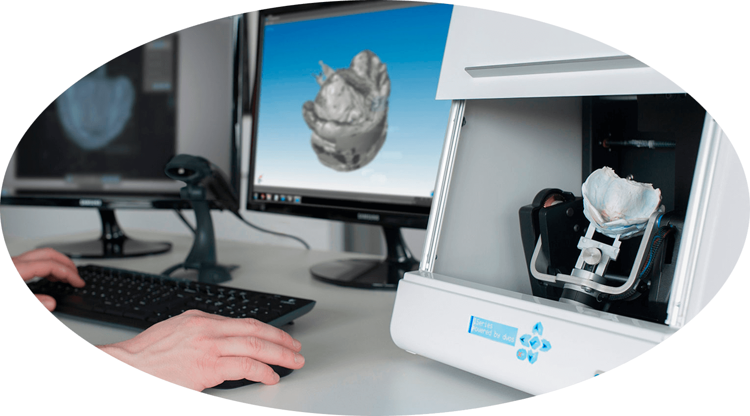 3Shape TRIOS®: беспорошковый интраоральный сканер с высокоточными 3D данными и реалистичными цветами, с функцией «AI Scan», которая устраняет нежелательные мягкие ткани для более быстрого снятия оттиска. Кроме того, 3Shape TRIOS® определяет оттенок зубов и записывает движения челюсти пациента, чтобы обеспечить получение оптимальной реставрации из лаборатории.